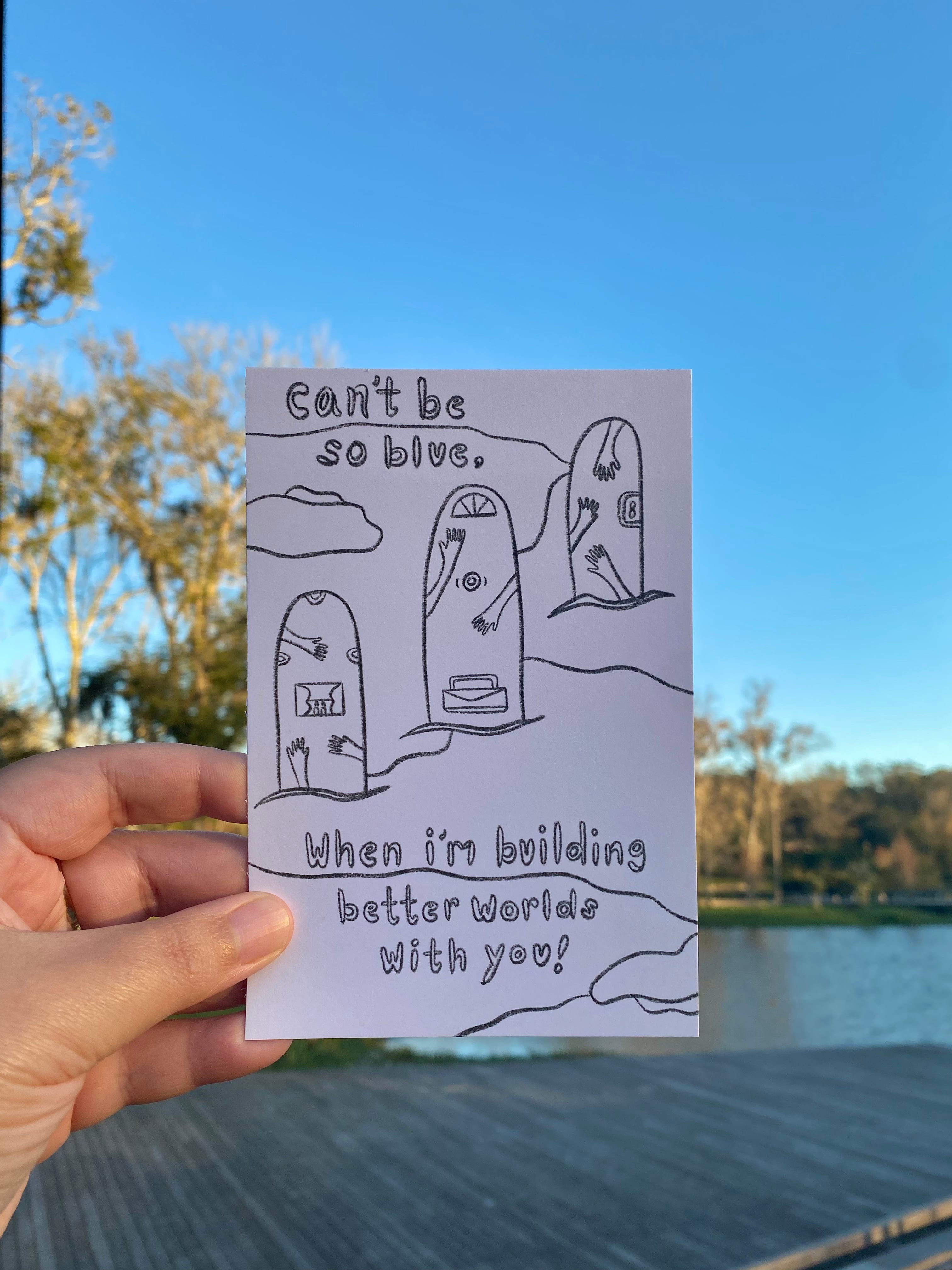My hand in nature, holding a post card I made recently that reads: can’t be so blue, when I’m building better worlds with you!