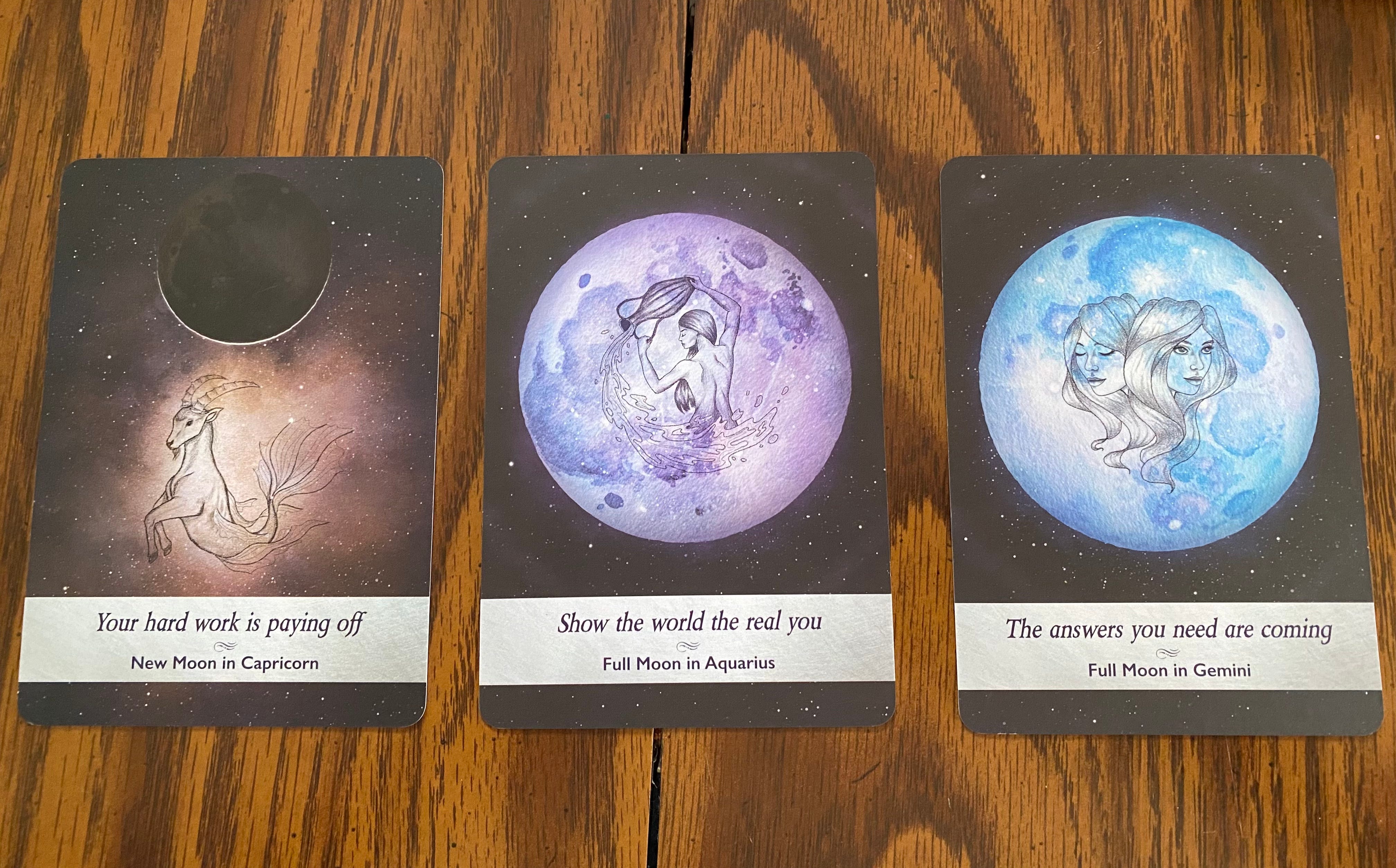 A three card spread from the Moonology deck earlier this month, from left to right: “Your hard work is paying off, New Moon in Capricorn, Show the world the real you, Full Moon in Aquarius, and The answers you need are coming, Full Moon in Gemini”.