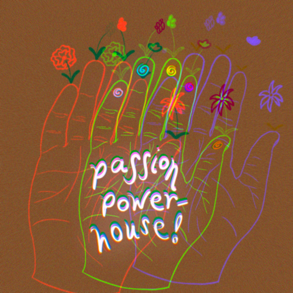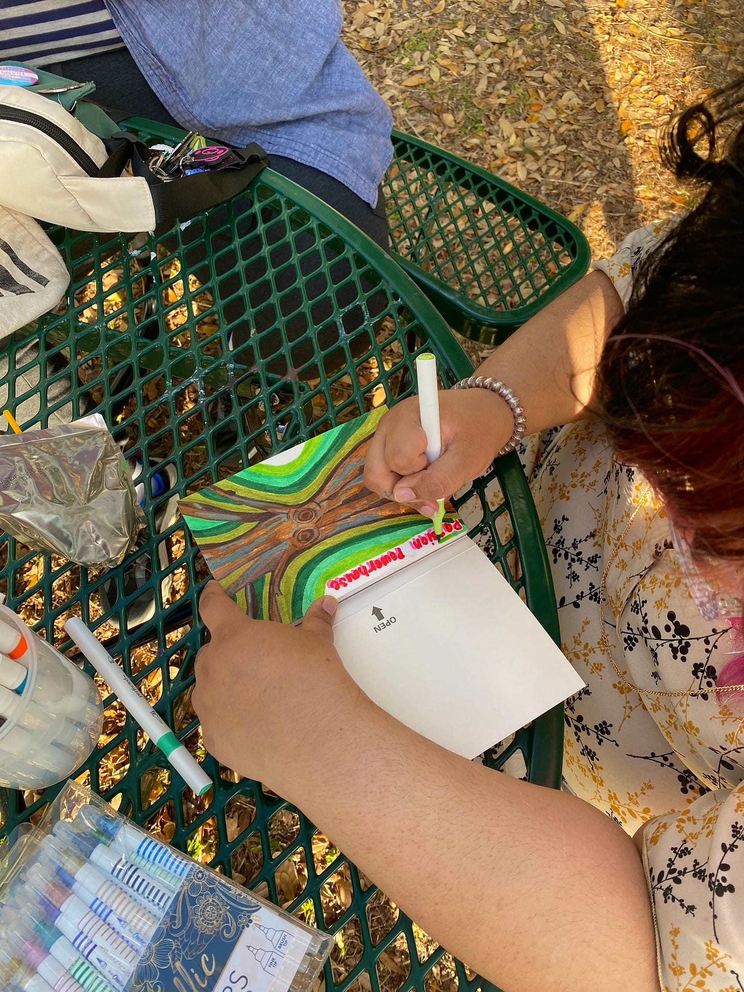 An angled shot from above of a new friend who attended the community picnic potluck earlier this month, drawing a beautiful tree surrounded by waves of different shades of green and has “passion powerhouse” written on the side <3